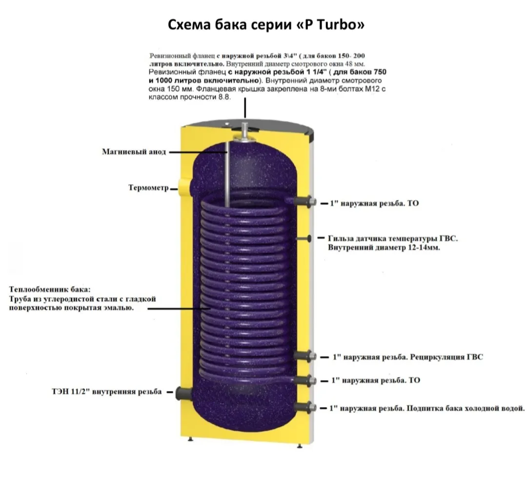 Описание: Эмалированный бак косвенного нагрева ГВС с одним увеличенным ТО от 29 до 63 кВт, с рециркуляцией, гильзой для датчика температуры и термометром. С ревизионным фланцем для очистки бака и ревизии, а так же отверстием 1 1/2″ для установки ТЭНов. В комплекте магниевый анод, регулировочные ножки и упаковка. Бак может совместно работать со следующими источниками тепла: